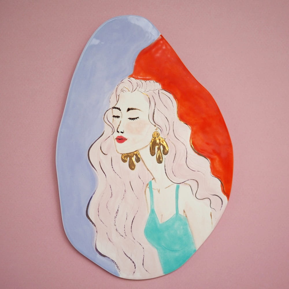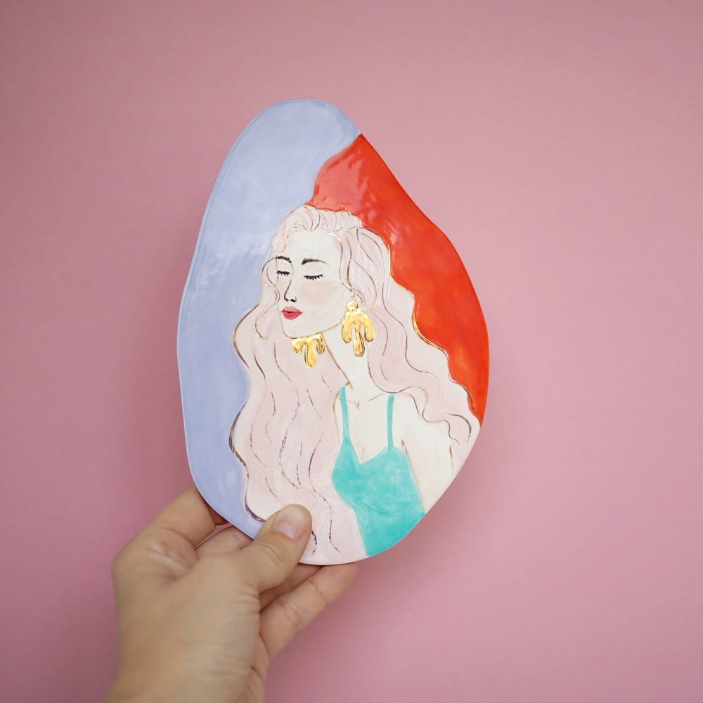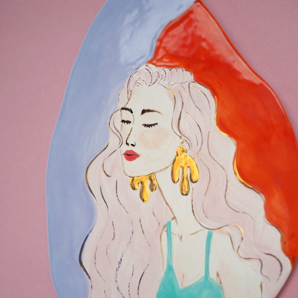 Obrazek ceramiczny przedstawiający kobietę w rozwianych włosach z zamkniętymi oczami, który ma przywoływać spokój, wytchnienie, radość oraz dobre wspomnienia :)