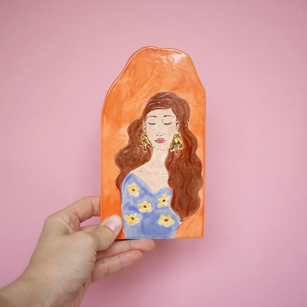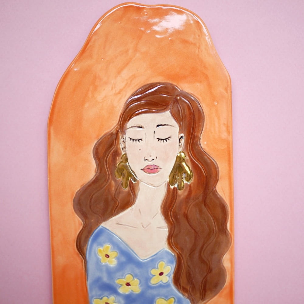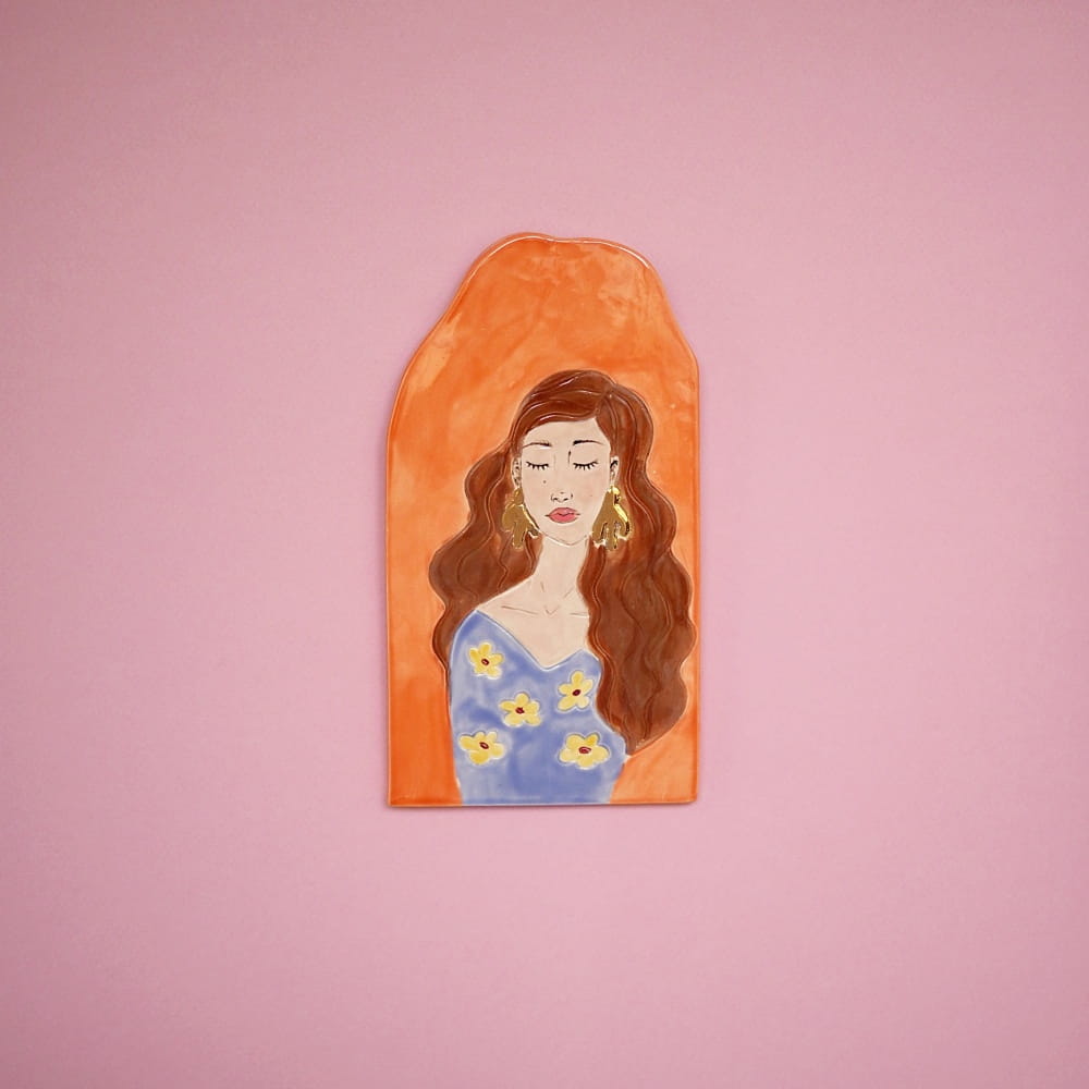 Obrazek ceramiczny przedstawiający kobietę w rozwianych włosach z zamkniętymi oczami, który ma przywoływać spokój, wytchnienie, radość oraz dobre wspomnienia :)